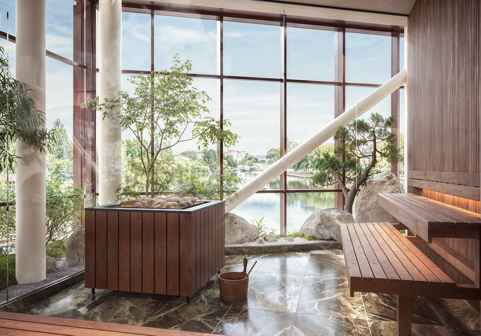 Spaet byggs i två våningar och erbjuder både inomhus- och utomhusmiljöer. På entréplanet planeras en stor uppvärmd pool, flera bastuupplevelser, upplevelseduschar och ett kallbad. Här finns också en så kallad champagnepool, där små bubblor ska ge en mjuk massageeffekt. Behandlingsrum och ytor för gruppbehandlingar kompletterar upplevelsen.
