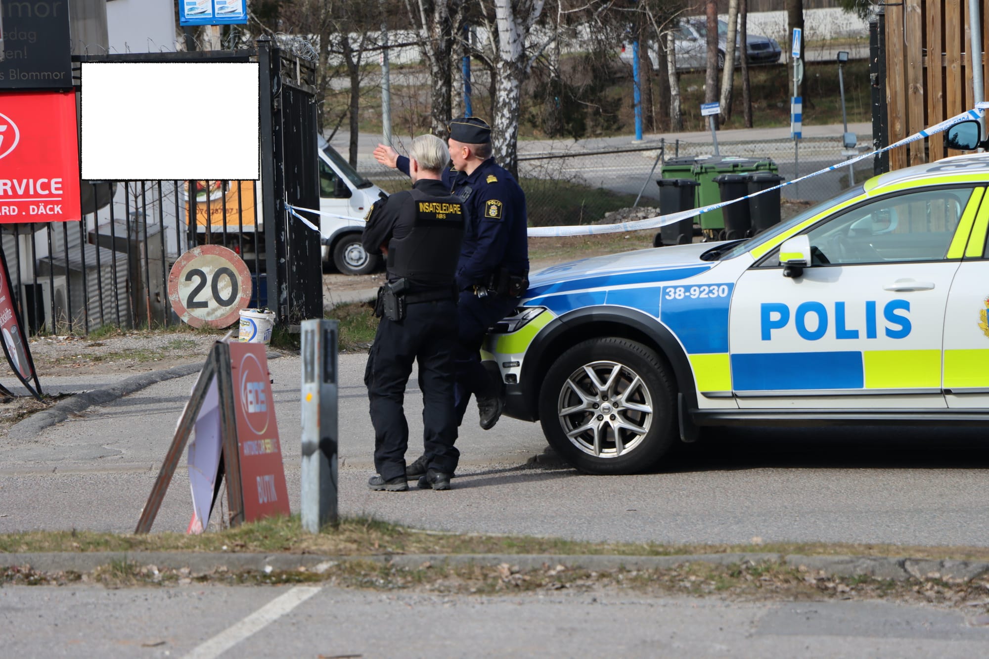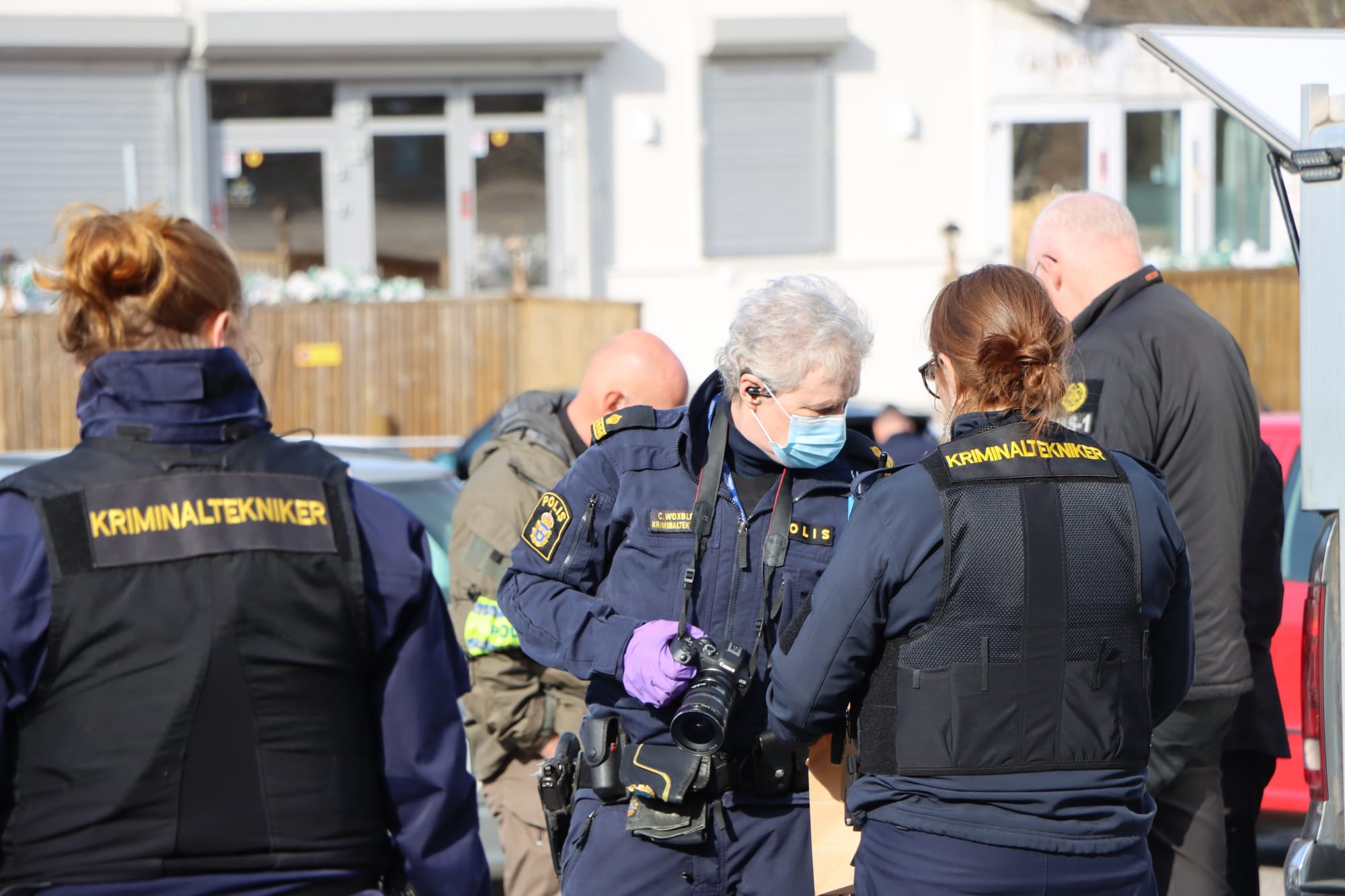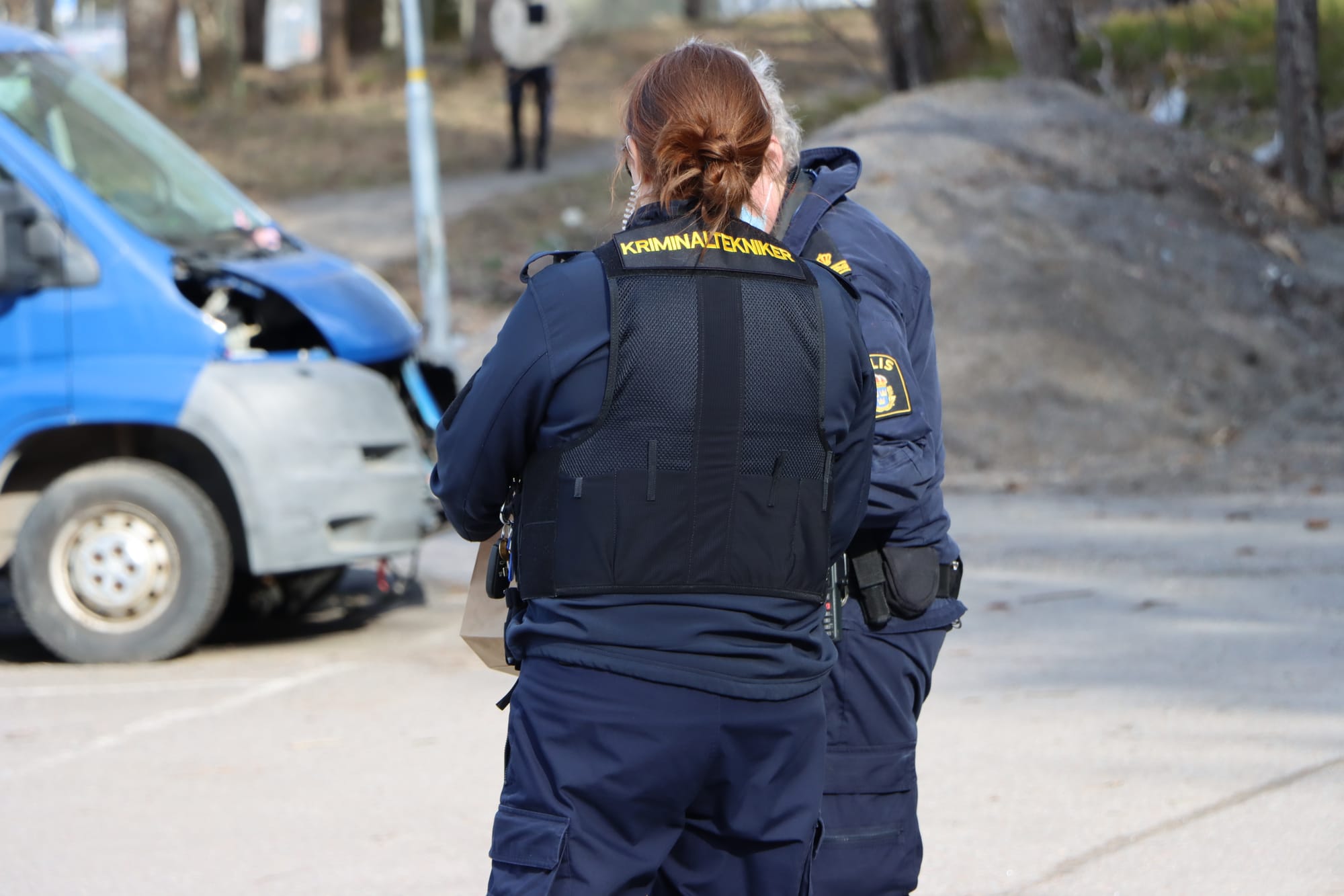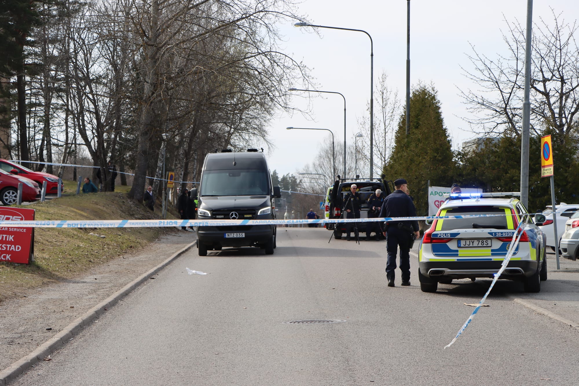 Flera polispatruller var på plats och satte upp avspärrningar i området. Polishelikoptern cirkulerade på låg höjd samtidigt som både polishund och specialsökhund arbetade på plats.