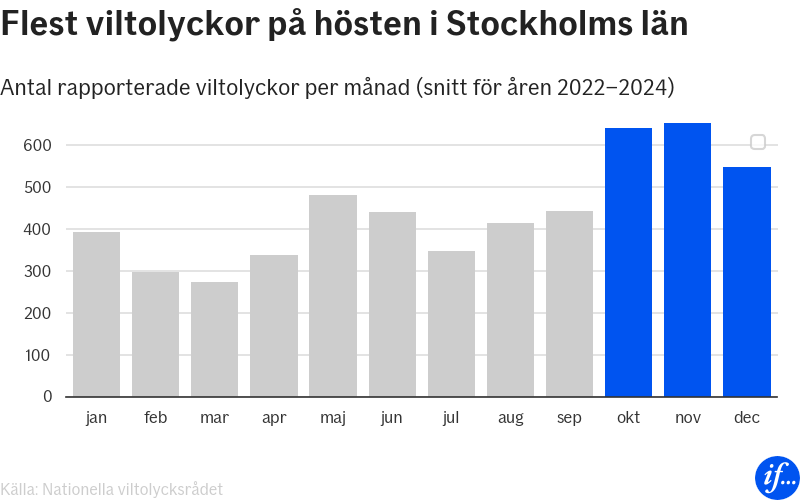 Hösten är den mest olycksdrabbade perioden i trafiken när det gäller vilt. Under oktober och november sker flest kollisioner med rådjur, älg och vildsvin. Bara i Stockholms län väntas omkring 1 300 incidenter under dessa månader – mer än 20 olyckor per dag.