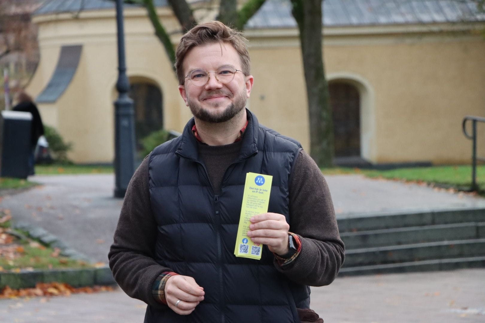 - Vi kör en liten Rogue-kampanj där vi lappar bilar med gula lappar. Men det är ingen parkeringsbot utan vi informerar folk om att vi nu tar bort taxa 1 i hela stadskärnan. Det vill säga den dyraste taxan som idag kostar 20 kronor kommer försvinna och går ner till 15 kronor istället, säger Alexander Rosenberg.
