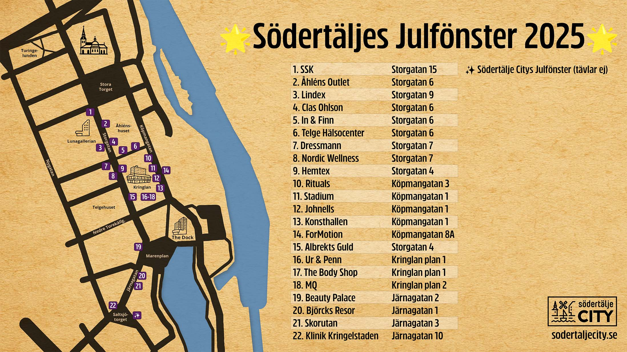 En särskild karta guidar besökare mellan alla julfönster och finns både på Södertälje Citys webbplats och i sociala medier.